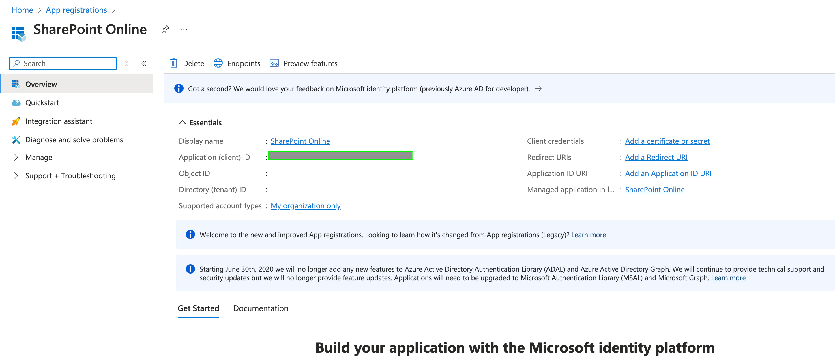 - Once you have registered your application, your Client ID will be displayed in the Application (client) ID field within the Essentials.