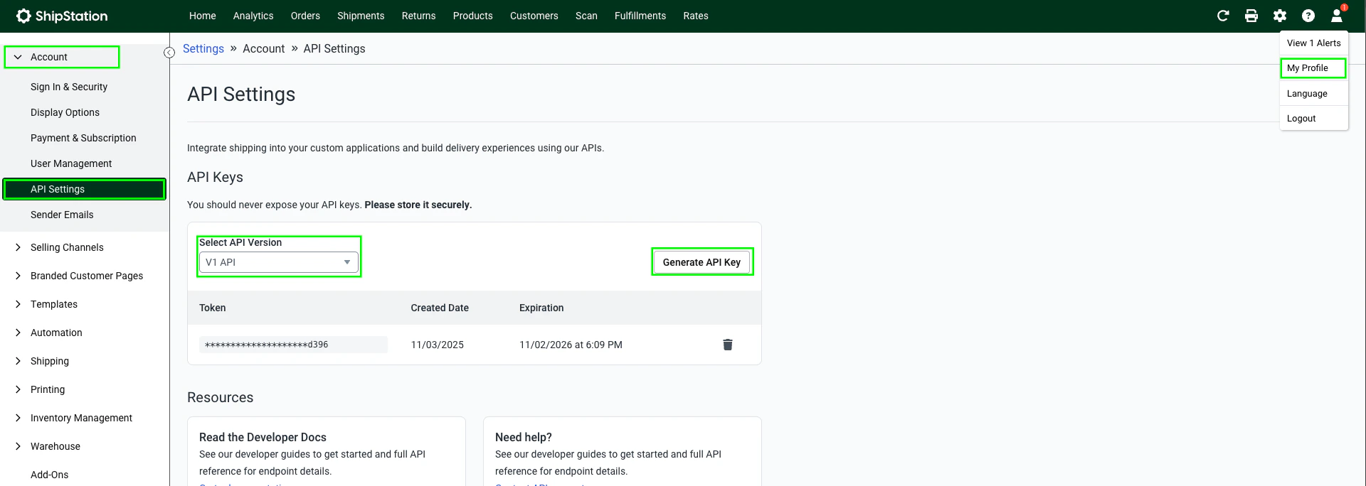 - Navigate to My Profile > Account > API Settings, then select V1 API from the Select API Version dropdown.