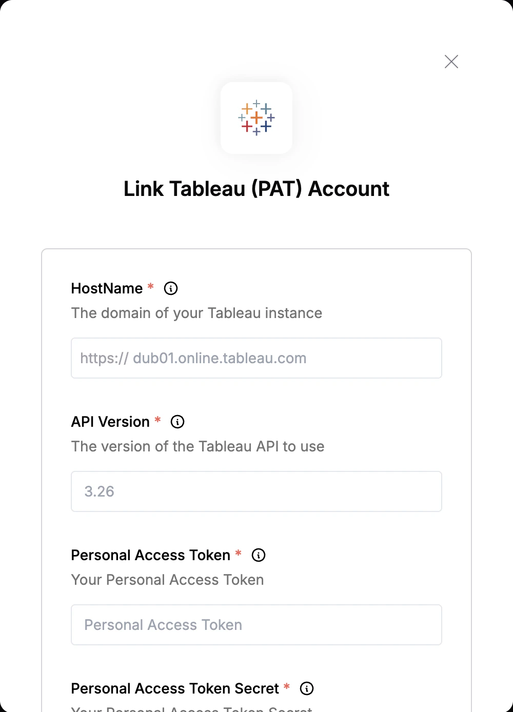 To authenticate with Tableau, you need:- Personal Access Token - This is the name/label you assigned to the Personal Access Token when you created it in Tableau.