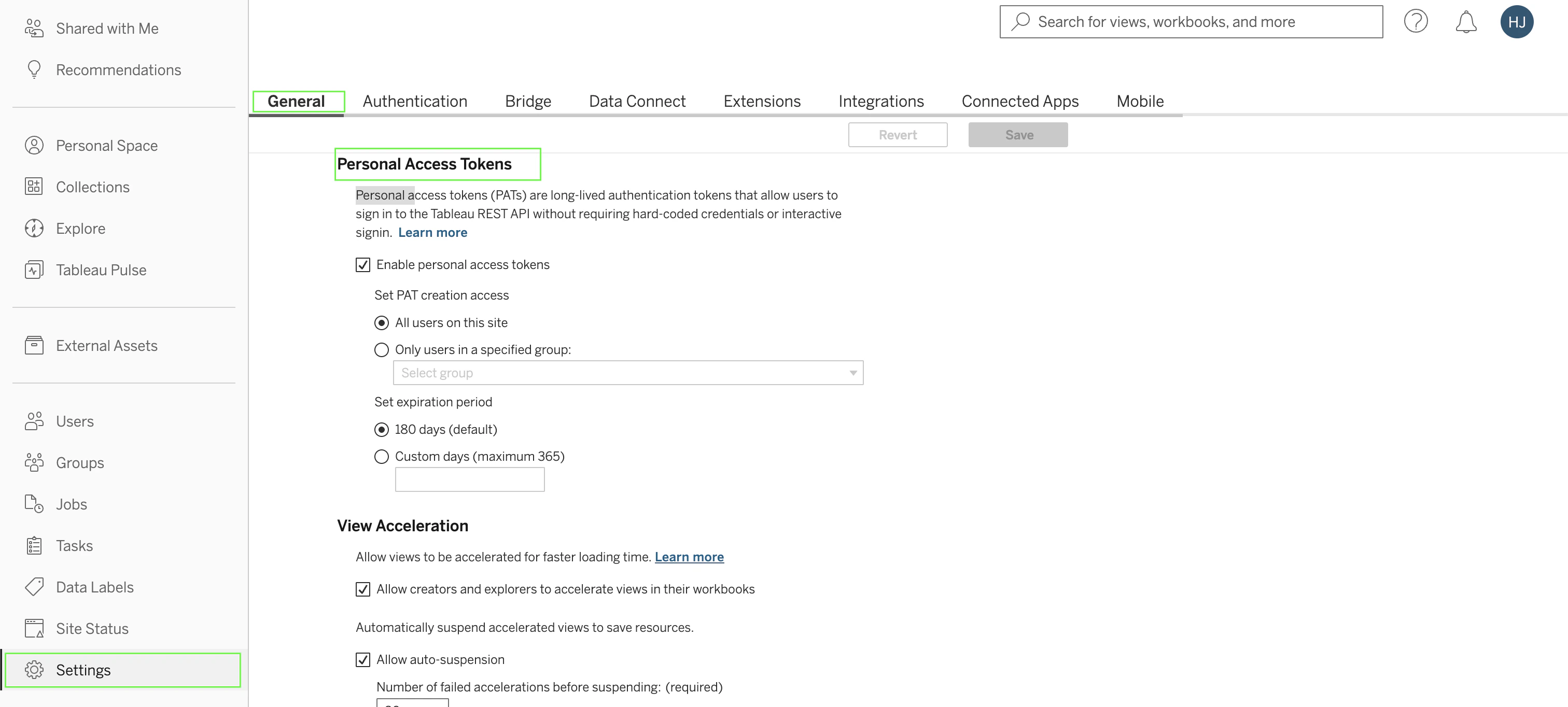 - Log in to your Tableau instance and naviagate to Settings > General.
