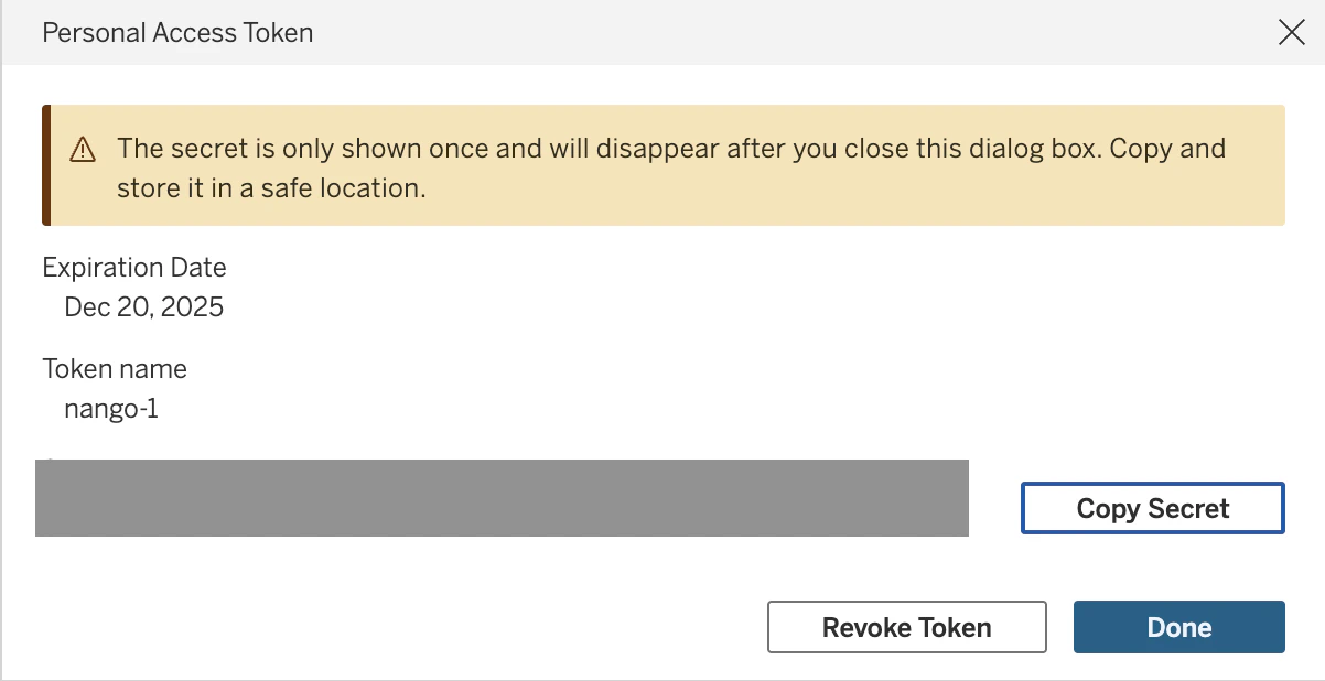 - A secret will be generated, this is your Personal Access Token Secret. Make sure to copy and store it securely, as it will not be shown again.