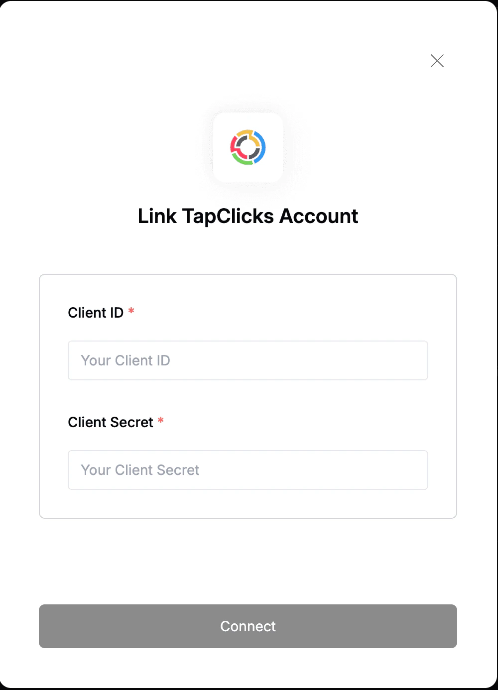 To authenticate with TapClicks, you need two key pieces of information:- Client ID - A unique identifier for your client.