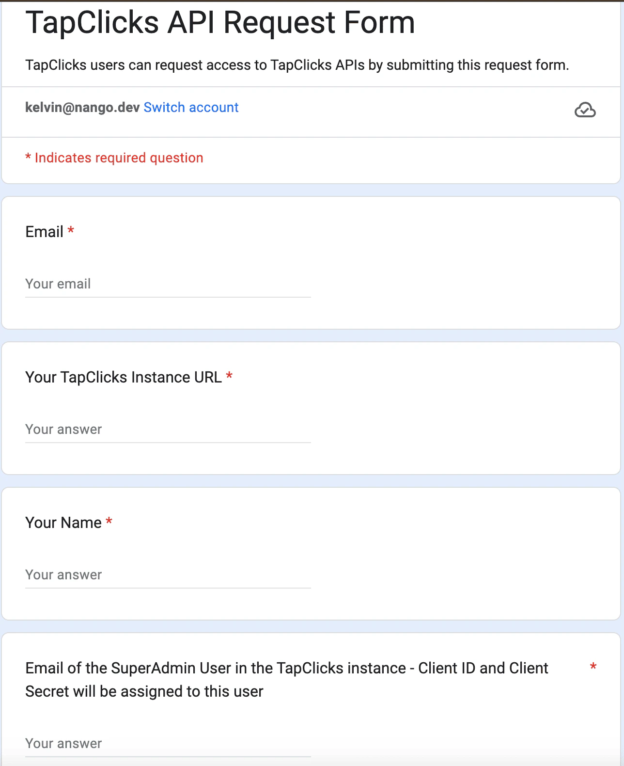 - Once this is done, an email containing the Client ID and Client Secret will be sent within 24-48 hrs, to the email address of the TapClicks super admin user who requested access.
