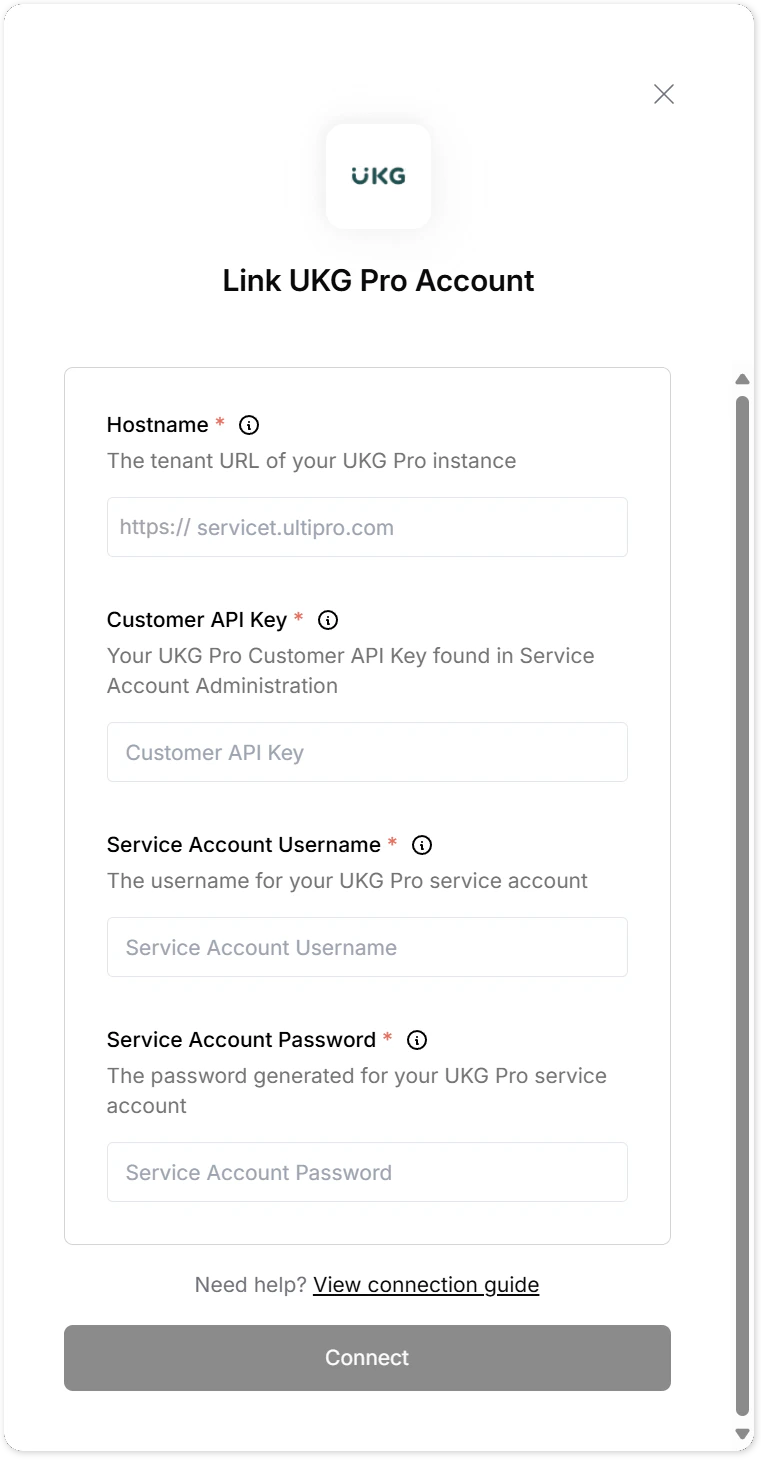 To authenticate with UKG Pro, you need:- Service Account Username - The username for your UKG Pro service account