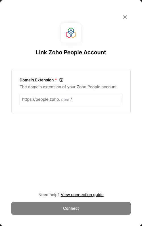 To authenticate with Zoho People, you need:- Domain Extension - This extension indicates the data center where your account is hosted.