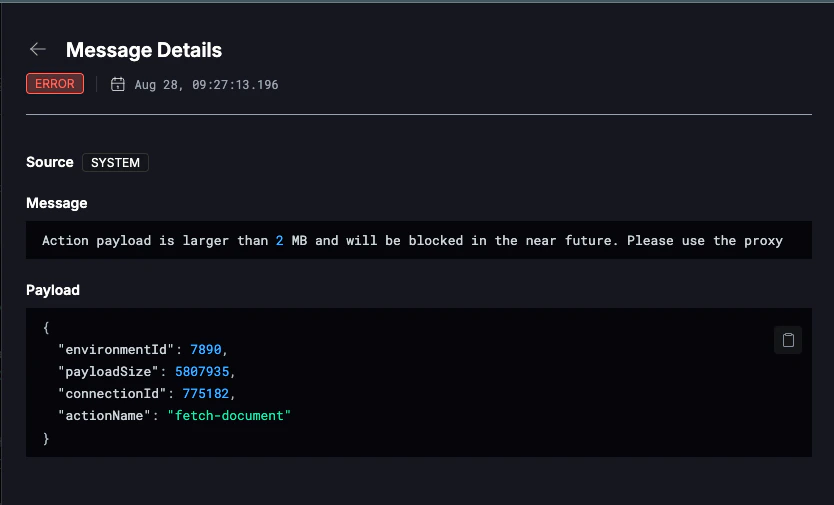 Nango actions currently have a documented output limit of 10MB. We are further restricting that limit to 2MB. Instead of using an action for large payloads like this, we encourage usage of the Nango proxy.Additionally, we will also soon restrict action inputs so please take note of your inputs.